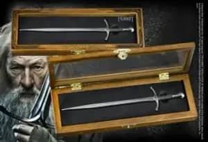 Original réplica en miniatura de la espada Glamdring de Gandalf el Gris tal y como aparece en El Hobbit: Un Viaje Inesperado (2012) del director Peter Jackson. Fabricada en acero de alta calidad, puedes utilizarla como abrecartas. Se presenta en una elegante cajita de madera con tapa de cristal, perfecta para regalo. Producto Oficial y Licenciado. Dimensiones aproximadas: 23 cms.