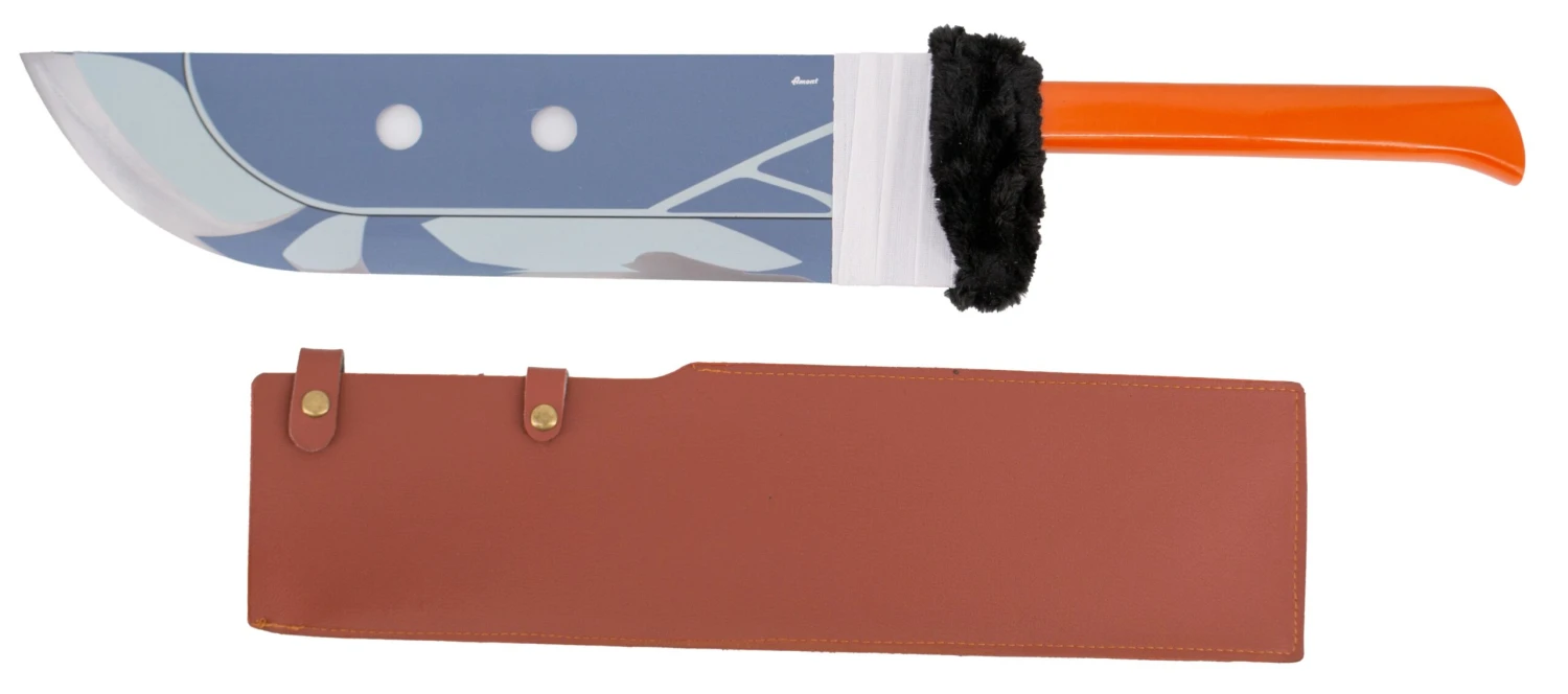 El cuchillo viene con un soporte, lo que facilita su exposición en cualquier colección. Con un peso total de 1475 gramos, este cuchillo tiene una sensación de solidez y equilibrio, ideal tanto para exhibiciones como para los eventos de cosplay.