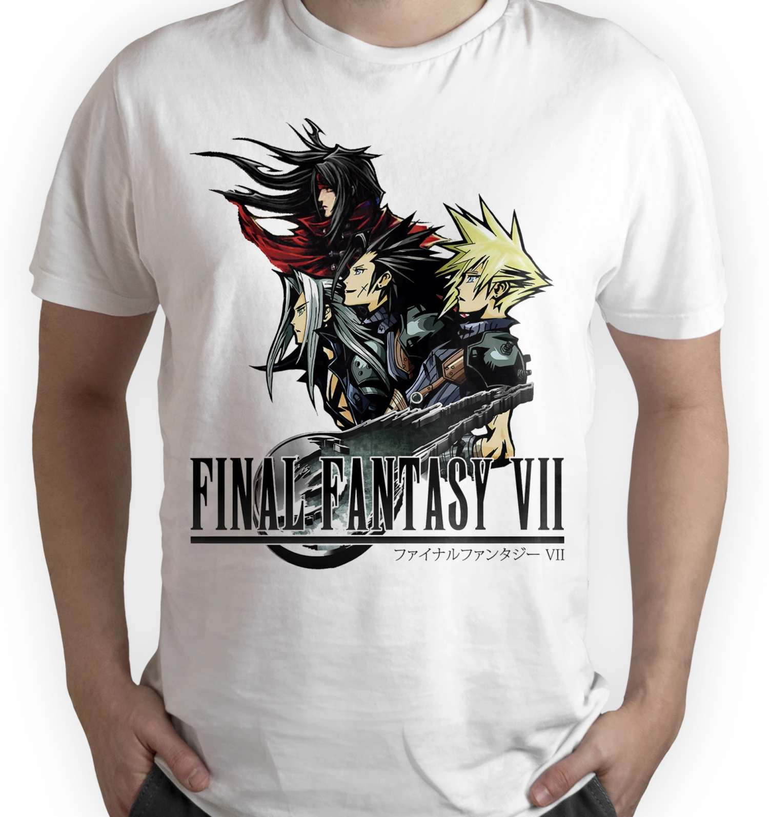 Esta camiseta blanca presenta un diseño impactante de «Final Fantasy VII», mostrando a algunos de los personajes más icónicos del juego: Cloud Strife, Sephiroth y Vincent Valentine. Cada personaje está ilustrado con un alto nivel de detalle, capturando su distintivo estilo visual y actitud. Cloud es mostrado con su característico cabello rubio y su enorme espada, mientras que Sephiroth se destaca con su larga cabellera plateada y su mirada intensa. Vincent, conocido por su estilo gótico, aparece con su larga capa roja y su expresión misteriosa.