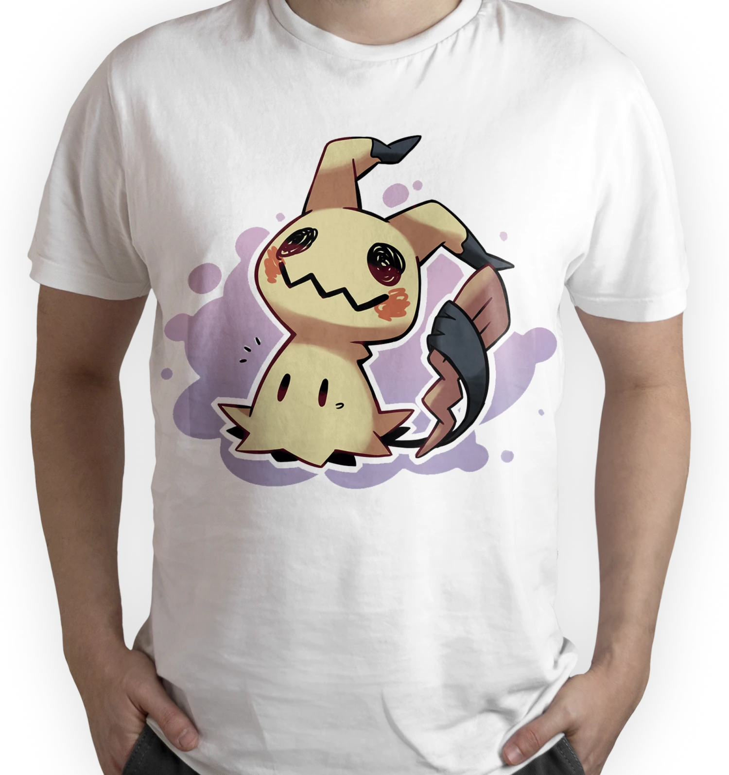 Esta camiseta blanca presenta un diseño encantador y juguetón de Mimikyu, el Pokémon de tipo Fantasma/Hada, conocido por su distintiva apariencia que imita a Pikachu. El diseño muestra a Mimikyu en su característica postura torpe, con su traje de Pikachu algo desgastado, revelando su verdadera forma oscura y misteriosa por debajo. El gráfico utiliza tonos de marrón y gris para su cuerpo y presenta sombras púrpuras y salpicaduras en el fondo, lo que añade un toque de misticismo y magia al diseño.