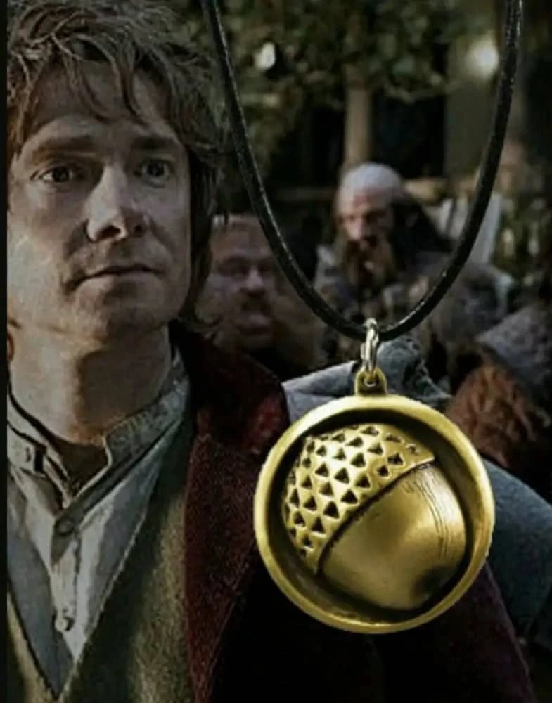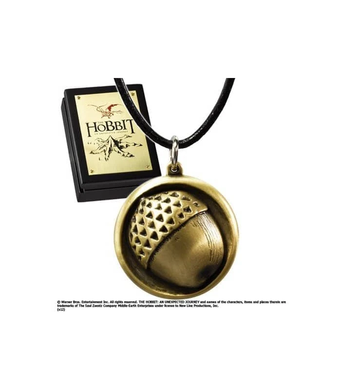 Colgante macizo con motivo de bellota en la cara y «Bilbo Baggins» grabado en el reverso Incluye correa de cuero con cierre de mosquetón seguro