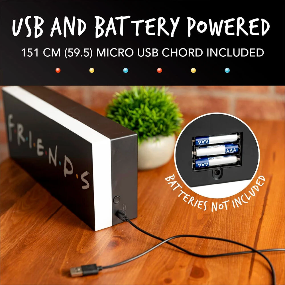 El fondo negro permite que las letras blancas de Friends y los diferentes espaciadores de colores destaquen cuando se iluminan con el cable USB proporcionado o 3 pilas AAA (no incluidas).