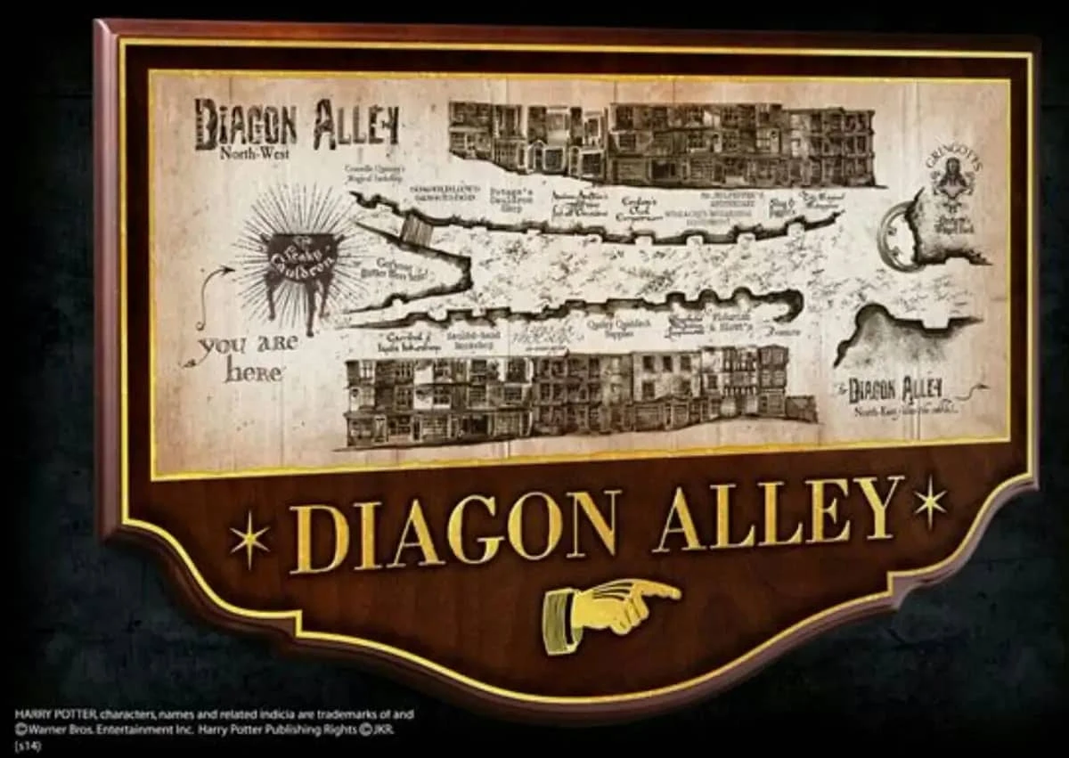 Placa de madera para colgar en la pared con el plano del Callejón Diagon (Diagon Alley) de la saga de películas Harry Potter.
