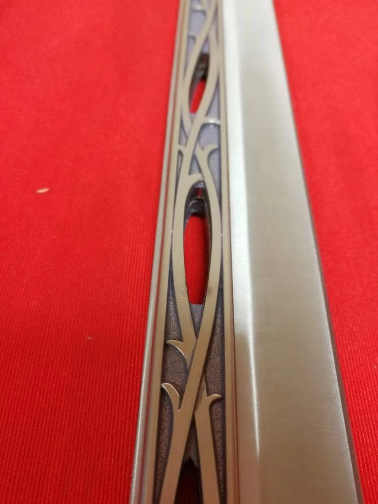La hoja y el mango elegante se forjaron a partir de una sola pieza de acero élfico y decoradas con zarcillos y hojas grabadas diseños que representan los bosques del Gran Bosque Verde.