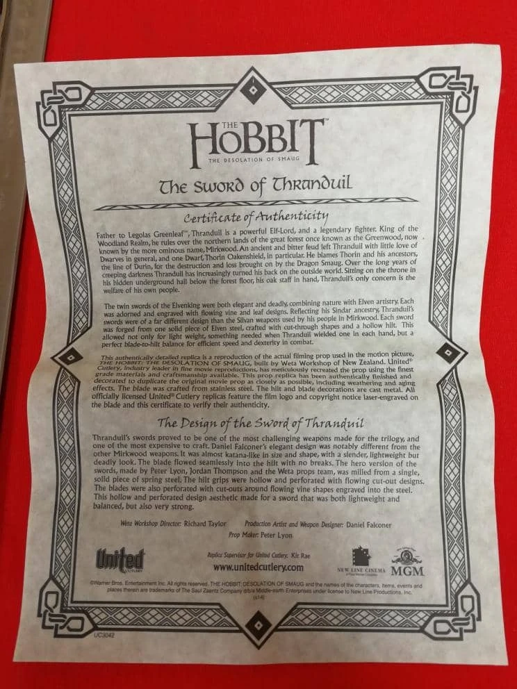 El paquete incluye un soporte de pared de madera con motivo gráfico de Thranduil, y un certificado de autenticidad.